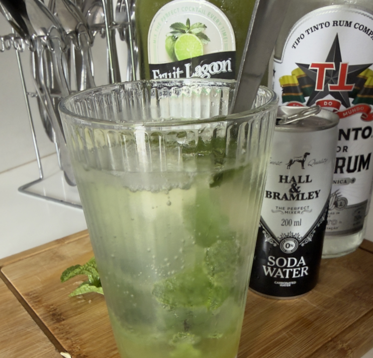For my first experiments, I used a Fruit Lagoon Cocktail Base: Mojito, paired with fresh mint, white rum, and soda water. Limes were impossible to find at the time, but thankfully, the base had that citrus element covered. What followed were a few variations and trials, adjusting quantities, tasting, pulling back, and trying again. The biggest lesson?